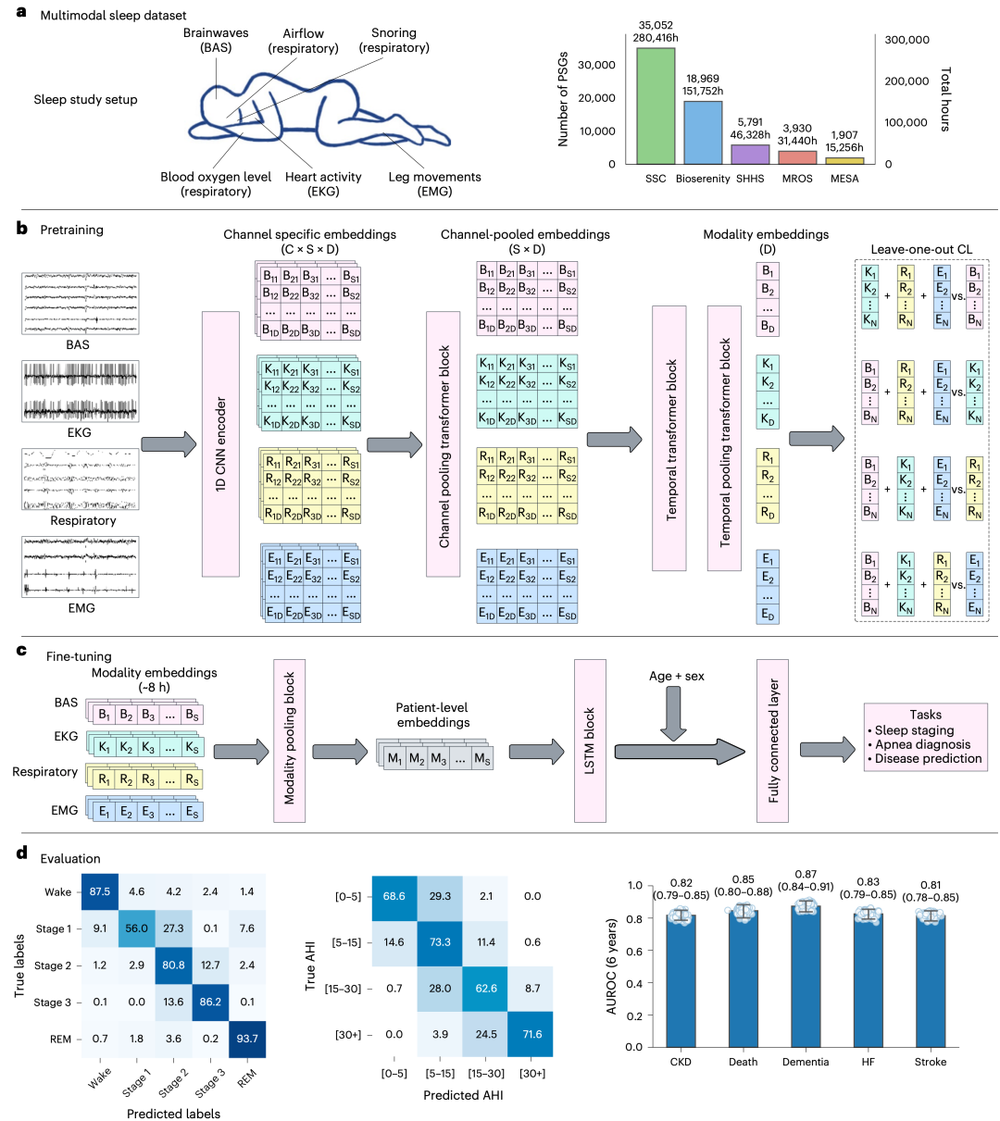 SleepFM框架描述,图A为多导图的设置情况,以及来自不同睡眠中心的数据统计。图B和图C是将不同模态的数据,例如心电图EKG、脑信号BAS、肌电图EMG等信号,通过神经网络编码,转成深度学习模型能训练的特征,并预测最后的结果。图D为临床应用的评估结果。