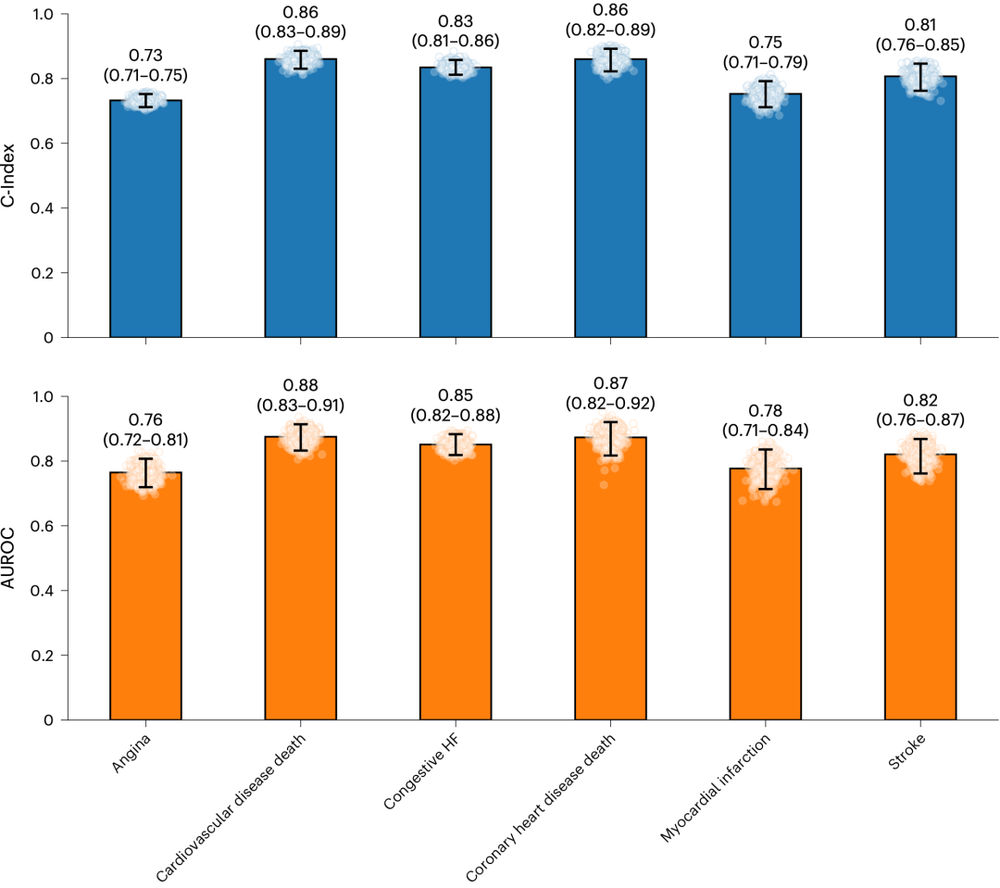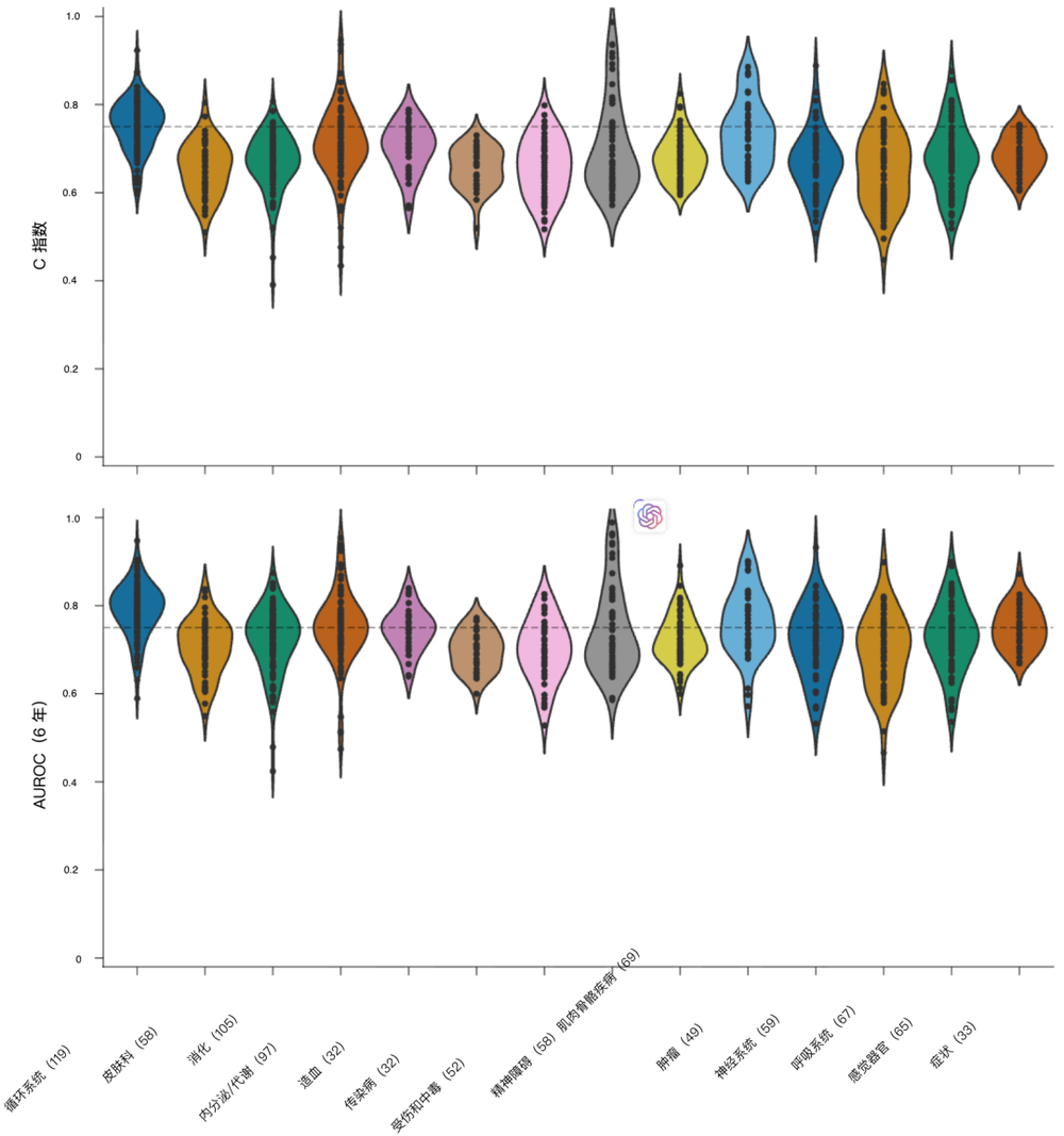在斯坦福内部测试集上,针对不同疾病大类(如循环系统、神经系统、肿瘤等)的整体预测表现。横轴列出了循环系统、精神障碍、神经系统甚至肿瘤等十多个大类。图中每一个黑点代表一种具体的病,位置越高,说明AI预测得越准(C-Index和AUROC越高)。可以看到,它在神经系统和循环系统疾病上的表现尤为突出,远超及格线(虚线表示)。