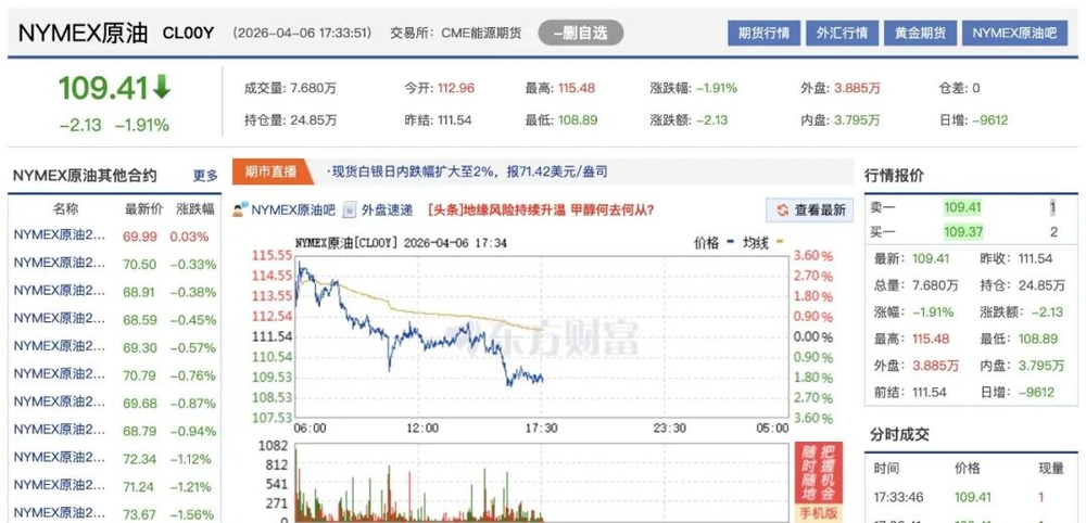 截至17:40左右,国际原油价格持续走低,WTI原油价格下跌1.91%,报109.41美元/桶;布伦特原油价格下跌1.8%,报107.07美元/桶。这一反应充分体现了市场对霍尔木兹海峡可能重新开放的预期,该海峡是全球关键石油咽喉要道,战前全球约五分之一的石油供应经此运输。