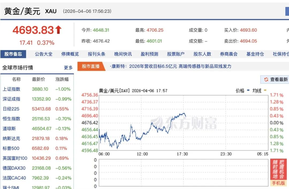 黄金市场同样经历了剧烈震荡。现货黄金在早盘一度下跌1.4%,跌破4610美元/盎司,一度暴跌近70美元。但停火谈判消息传出后,黄金收复部分失地,缩减跌幅,交投于每盎司4693.83美元附近。