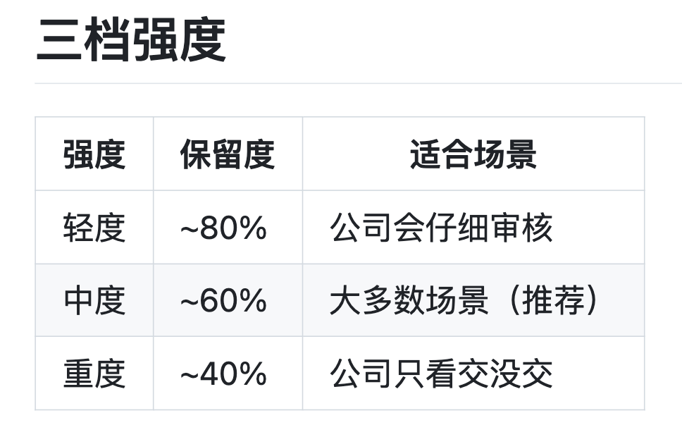 可以依照公司的审核仔细程度决定清洗强度,完整版本只保留在自己手上。