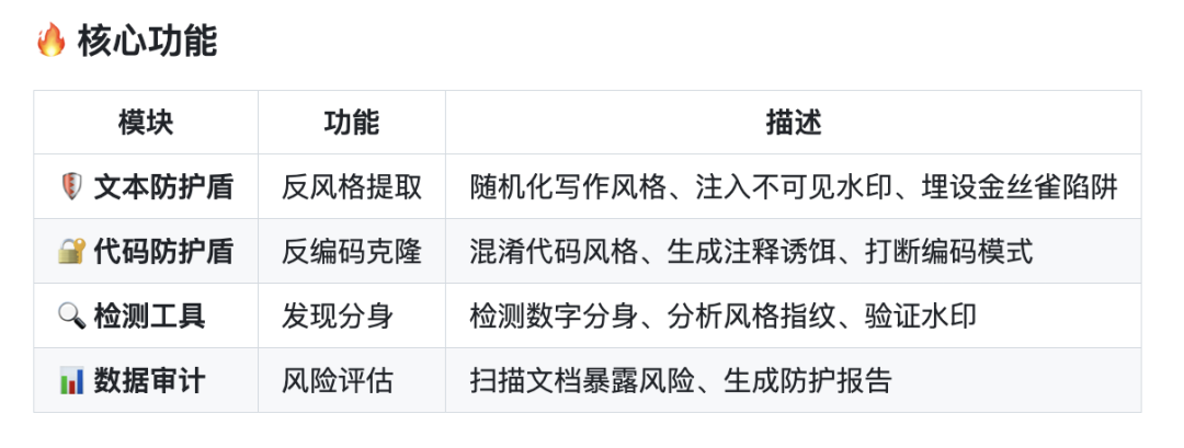 这个工具加入三层防护系统:第一层是混淆——写作风格随机化、代码风格混淆、语义噪声注入,让AI提取不出你的模式;第二层是追踪——在文档里嵌入肉眼不可见的零宽字符水印和金丝雀陷阱,一旦AI复述出来就是铁证;第三层是检测——风格指纹对比和水印验证器,帮你揪出有没有被人偷偷蒸馏。