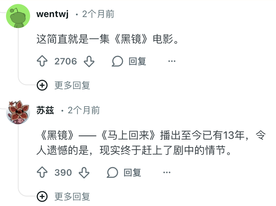 在《黑镜》第二季中第一集,女主角玛莎的男友因车祸去世后,她利用男友生前在社交网络上留下的数字足迹,生成了一个具有其声音和意识的AI程序,最后甚至获得了一个拥有男友外貌的实体机器人。