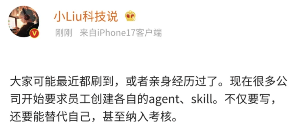 现在很多公司要求员工全员写自己的Skill,美名其曰“知识沉淀”,其实是一场针对生产力的资产盘点。让员工将个人工作经验文档化,脱水处理成可以被AI理解并运行的说明书。