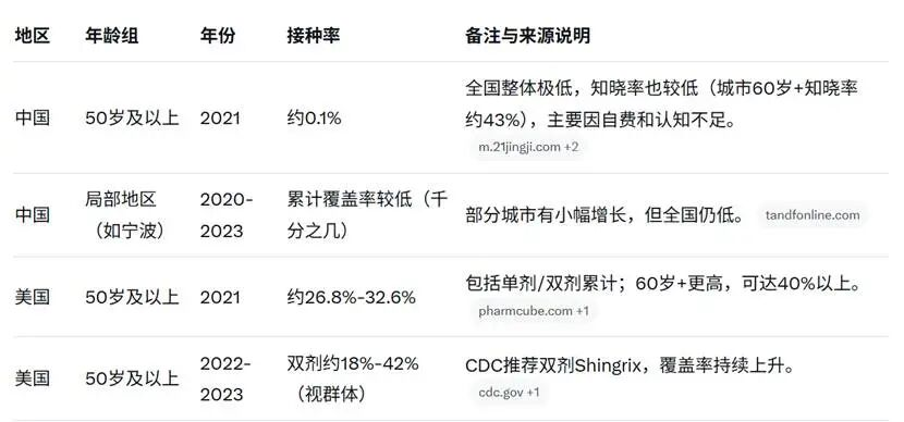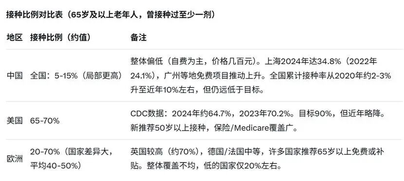 美国成人(18岁及以上)整体接种率通常在45%~50%左右;其中18~49岁人群较低(2024-2025季节约36.3%),50~64岁中等,65岁及以上老年人较高(近年约65%~70%)。