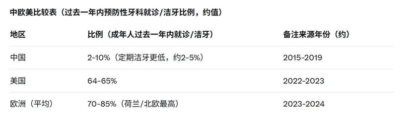 中国居民预防性口腔就诊习惯较差,定期牙科就诊率仅约2%-10%。
