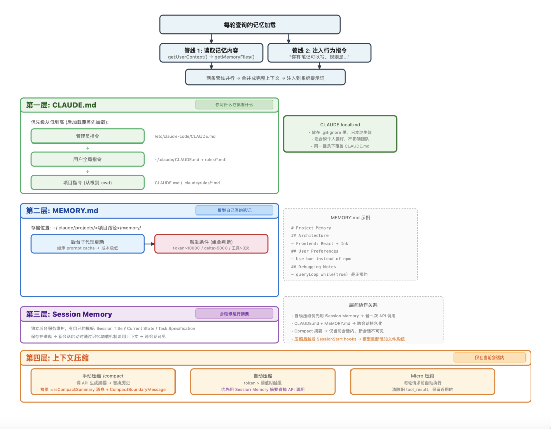 四层记忆系统总览:两条并行加载管线+CLAUDE.md/MEMORY.md/Session Memory/上下文压缩四层记忆各司其职
