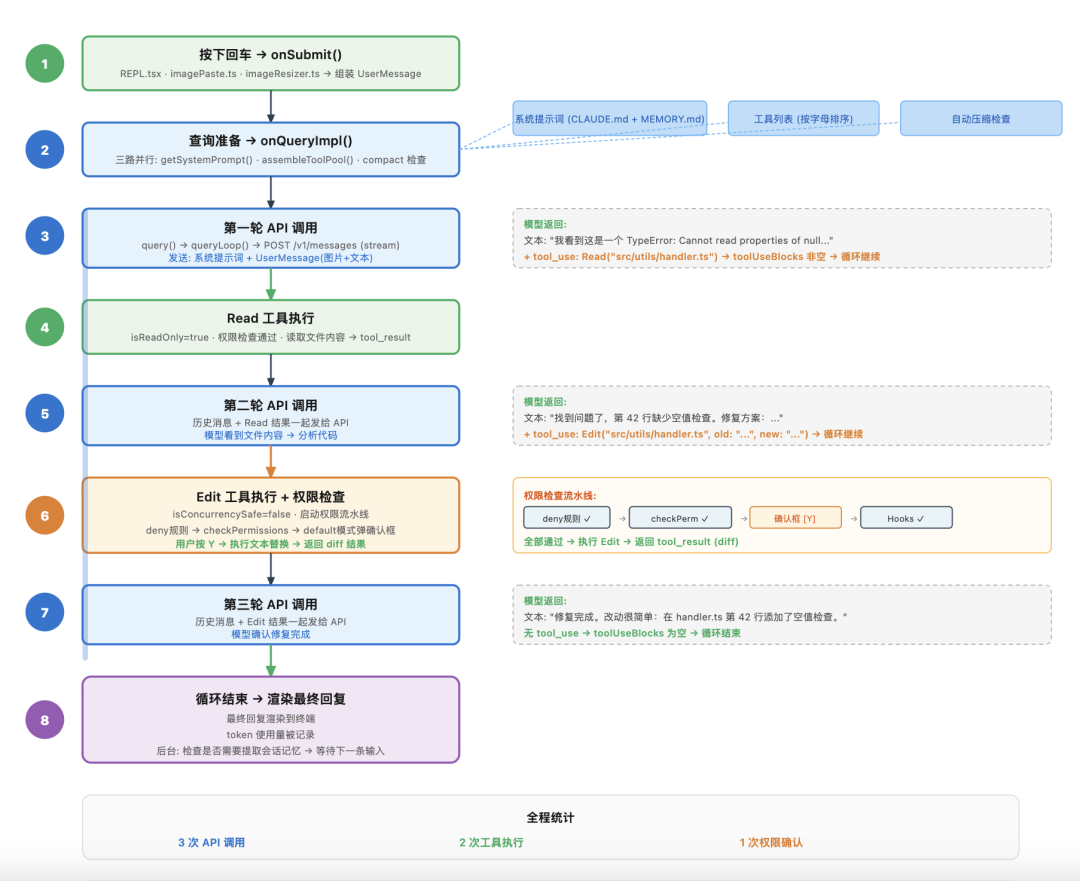 完整链路回顾:8个步骤、3轮API调用、2次工具执行、1次权限确认,从按下回车到修复完成。
