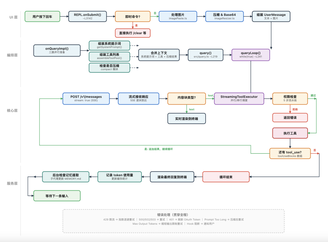 从按下回车到看到结果,这条消息穿过了UI层、编排层、核心系统层、服务层,经过了好几轮API调用和工具执行,通过了权限检查,最终带着修复结果回到了你的终端。