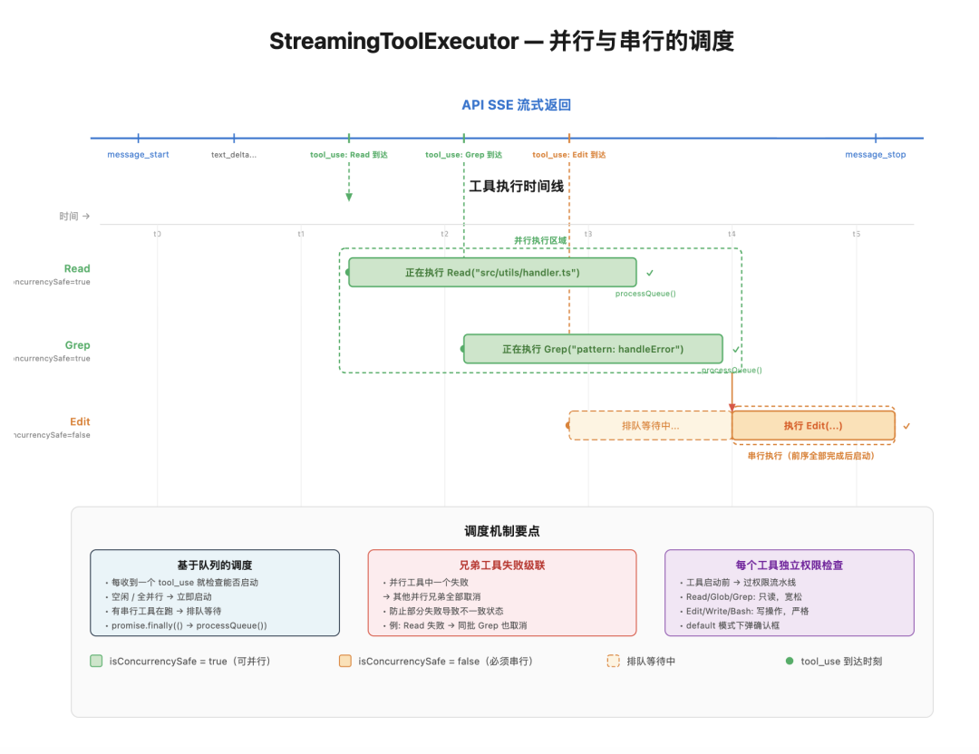 流式工具执行。不等所有tool_use到齐再执行,而是边接收边执行。能并行的并行,必须串行的排队。在模型一次请求多个工具的场景下(这在Claude Code里很常见),这减少了等待时间。