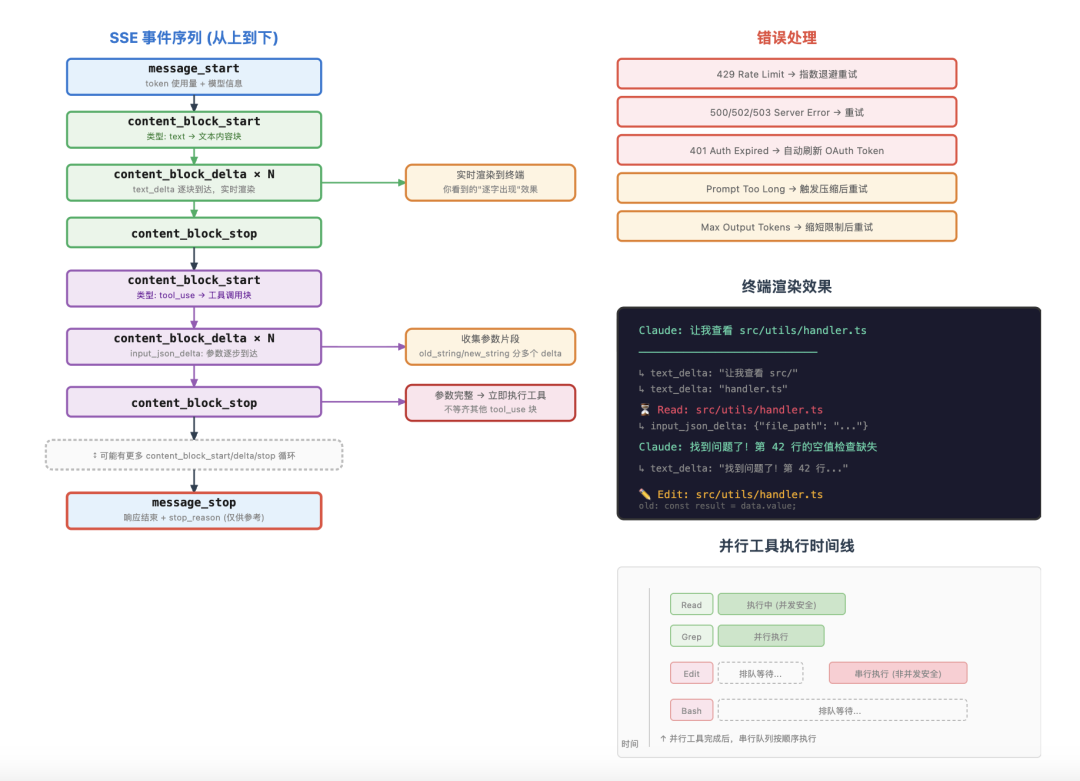 SSE事件序列与终端渲染:message_start→content_block_start/delta/stop→message_stop,文本实时渲染,tool_use参数流式收集