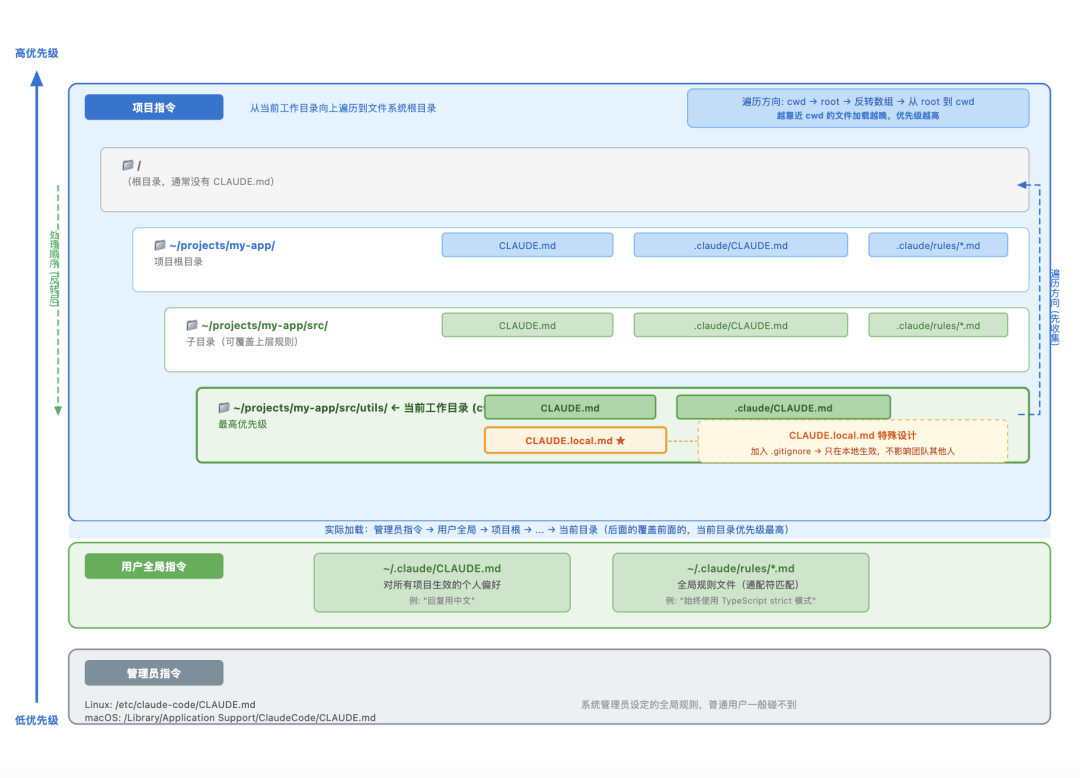 CLAUDE.md文件发现与优先级:管理员指令→用户全局→项目指令(从根到cwd遍历),越靠近当前位置优先级越高