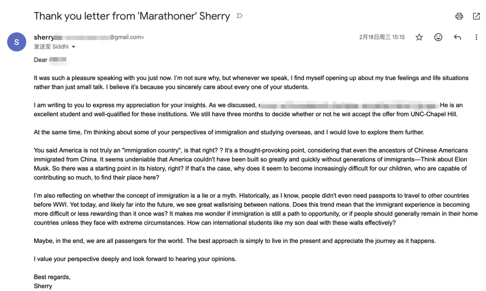 虽然我不能完全同意她,但不可否认,Siddhi的局内人视角让我多了一个思考维度,让作为中式家长的我缩小了Ego,不再以局外人的态度,批评美国现行的移民和留学政策。