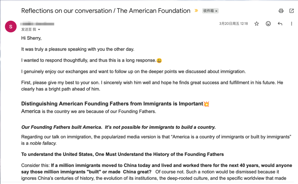 我在邮件里提到我担忧如今国与国之间已筑起了高墙,然而按Siddhi的逻辑,她可能认为墙的目的不是阻挡,是维护,维护美国这座“房子”的秩序不被破坏,以使美国仍然保持它对移民的吸引力。这也就解释了她为什么重点讲了国父们的故事,而略去了对移民史的关注。