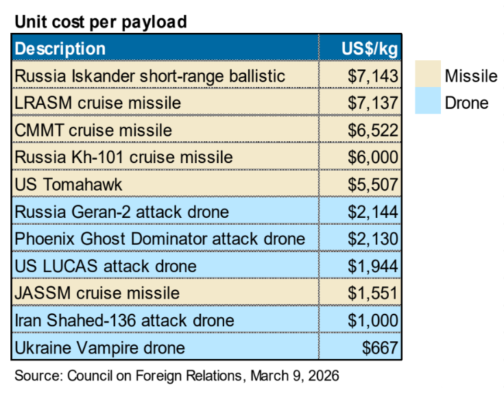 别看武器名号震天响。就看一个极其残酷的核心指标:“每公斤有效载荷的造价”。在摩根大通那张把美军底裤扯下来的图表里,对比极其惨烈。