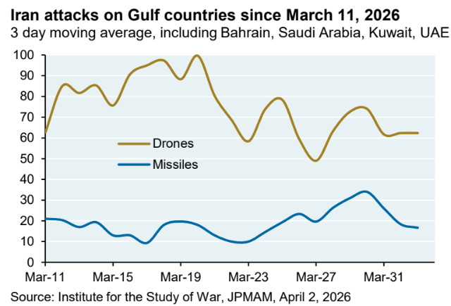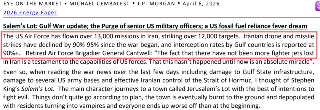 摩根大通的分析师们还是先给足了面子。报告开头列了一串神仙数字。美国空军在伊朗飞了1万3千多架次。劈头盖脸炸了1万2千多个目标。战绩表极其漂亮。伊朗的无人机和导弹袭击锐减了90%到95%。美国和海湾国家的防空拦截率稳在90%以上。有位退役的美国空军准将甚至得意洋洋。他吹嘘说,我们的战斗机一架没掉。这绝对是美军的奇迹。