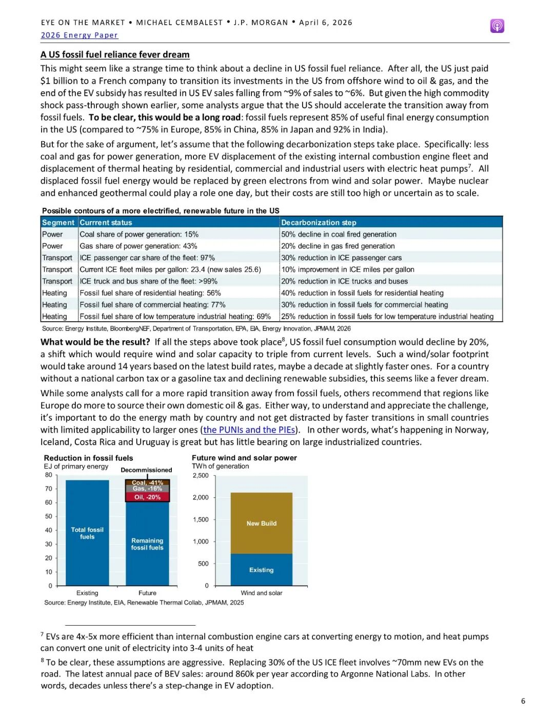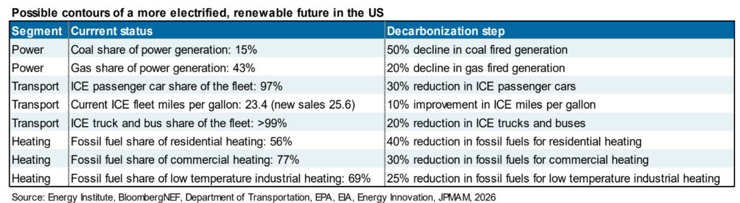 摩根大通的会计们动手算了一笔账:他们做了一个非常宽泛的奇迹假设:假设美国一半的煤电厂瞬间关门,假设街上很大一部分燃油车神奇地全部变成了电动车,再假设全国的供暖都换成了吃电的热泵。如果这些天大的“奇迹”全部发生了,你知道化石能源总消耗能减少多少吗?答案令人非常尴尬:只有区区的20%。