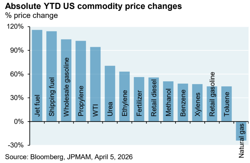 挑几个刺激的数据。美国国内原油涨了112%。批发汽油涨了110%。石脑油涨了122%。航运燃料疯涨了123%。这简直是把脸按在地板上摩擦。你美国本土抽出来的油,凭什么在国内也翻倍涨?