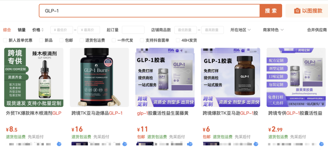 ●在某B2B平台搜索“GLP-1”,已有商家提供制药一站式服务。图源:网络