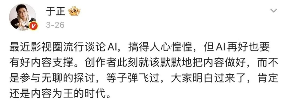 对此,不少影视行业鼎鼎有名的导演、CEO都出来讨论过。最爱凑热闹的导演于正在微博上说,这只是一阵风,“让子弹再飞一会儿”。
