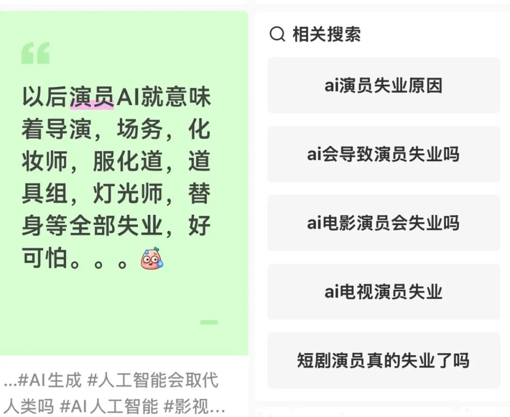 两位AI演员出道那天,“男二以下都用AI”,这条传闻,冲上热搜第一,小红书的焦虑帖子一夜之间多了起来。