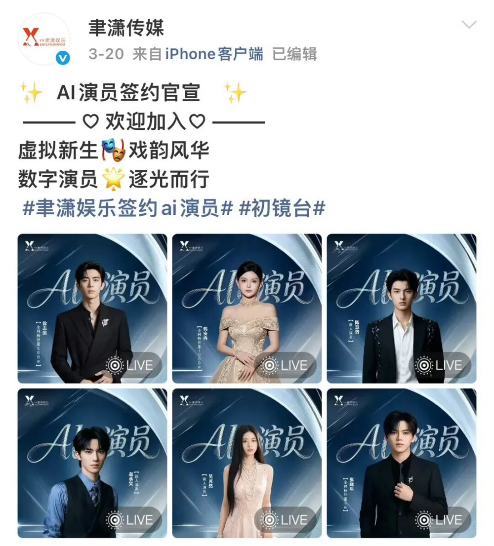 另一边,AI演员批量出道。耀客传媒刚推出两名AI演员,其首部AI剧《秦岭青铜诡事录》也即将正式播出。随后,聿潇传媒也直接签约6名,连网红韩安冉、徐志滨的数字形象也赫然在列。