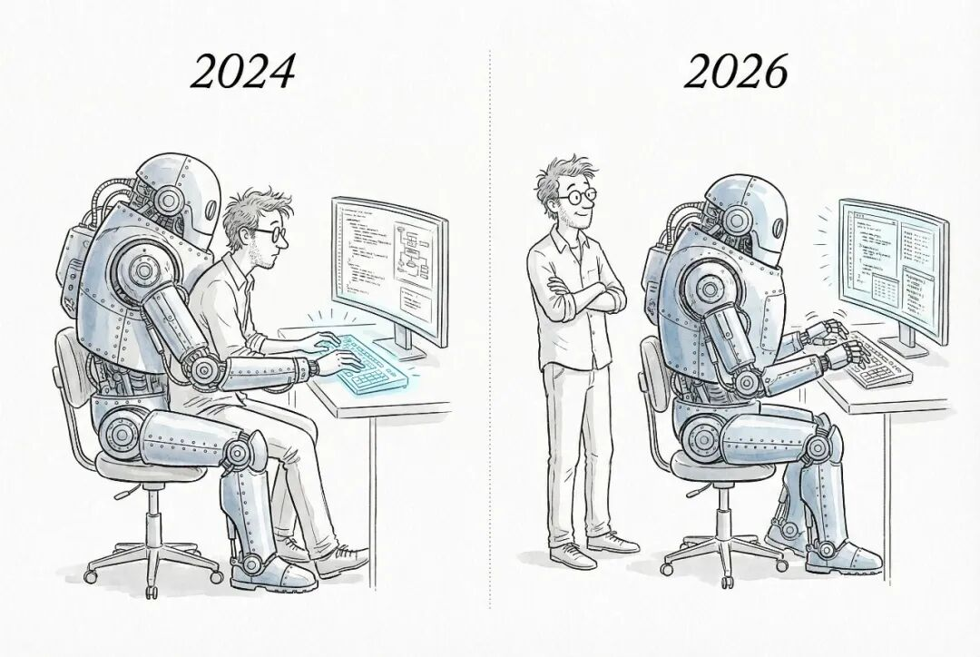 2023 年到 2025 年间,至少两个慢层在同时移动:大语言模型的编码能力越过实用阈值,AI 编码从新奇玩具变成生产力工具;软件开发流程开始被 AI 重塑,“AI 编码工具”从可选项变成必备项。