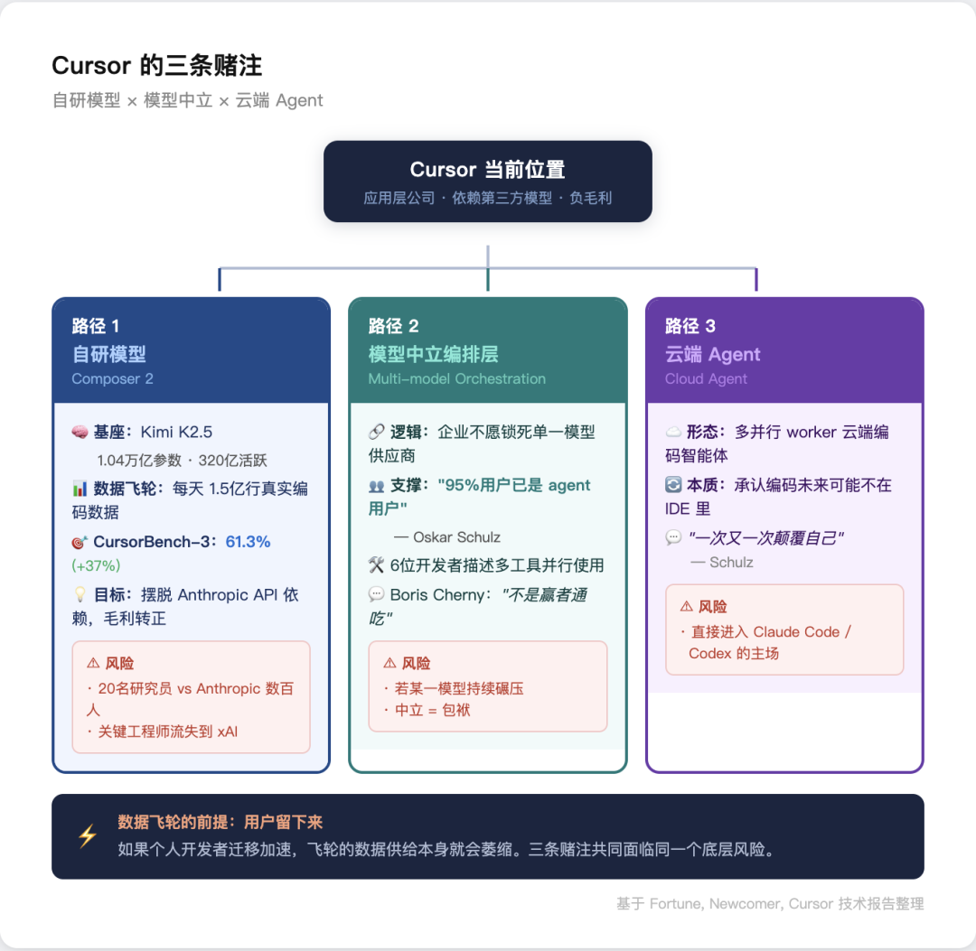 三条路径——自研模型、模型中立编排、云端 agent——构成了 Cursor 应对的完整图景。但每一条路都面临各自的约束。