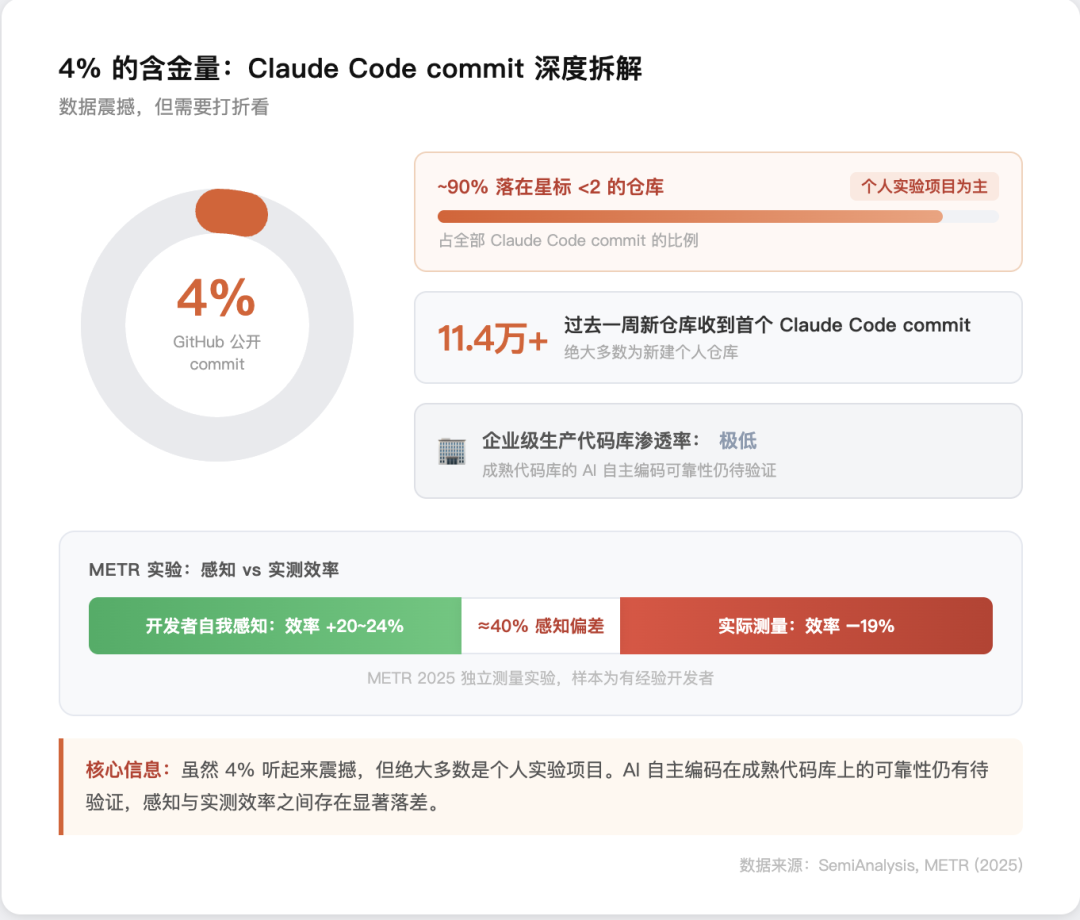 SemiAnalysis 的 4% commit 数字听起来震撼,但一项后续分析揭示了关键细节:Claude Code 在 GitHub 上的 commit 中,大约 90% 落在星标不到两颗的仓库里——绝大多数是个人实验项目而非生产代码。