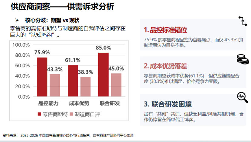 75.9%的零售商把品控视为首要痛点,但只有43.3%的制造商认为自身存在明显不足;61.1%的零售商希望获得成本优势,但供应链端真正能配合到位的比例只有38.3%;大家都在讲联合研发,但一谈到开模、技改、试错和失败成本,合作很快就卡住了。