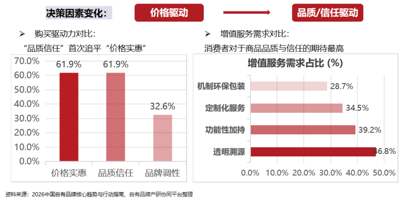 过去很长一段时间,自有品牌最直接的标签就是便宜、替代、白牌。能卖出去,主要靠价格差。但这次调研显示,消费者对自有品牌的购买驱动力已经发生变化,“品质信任”第一次追平“价格实惠”,消费者对商品品质、信任感和附加服务的期待明显抬升。今天自有品牌当然还要讲价格,但只讲价格已经不够了。