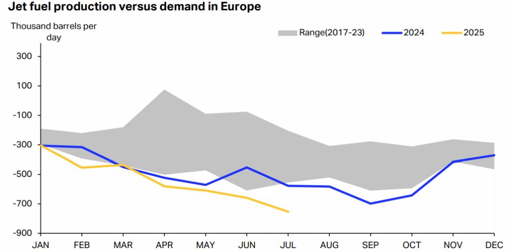 简单来说,一边是外部进口燃料不足,另一边是内部炼油能力收缩,欧洲整个航空燃料供应体系几乎崩塌。