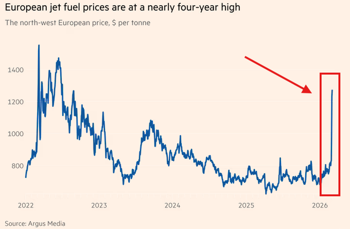 图说:2026年3月以来欧洲航空燃料价格暴涨