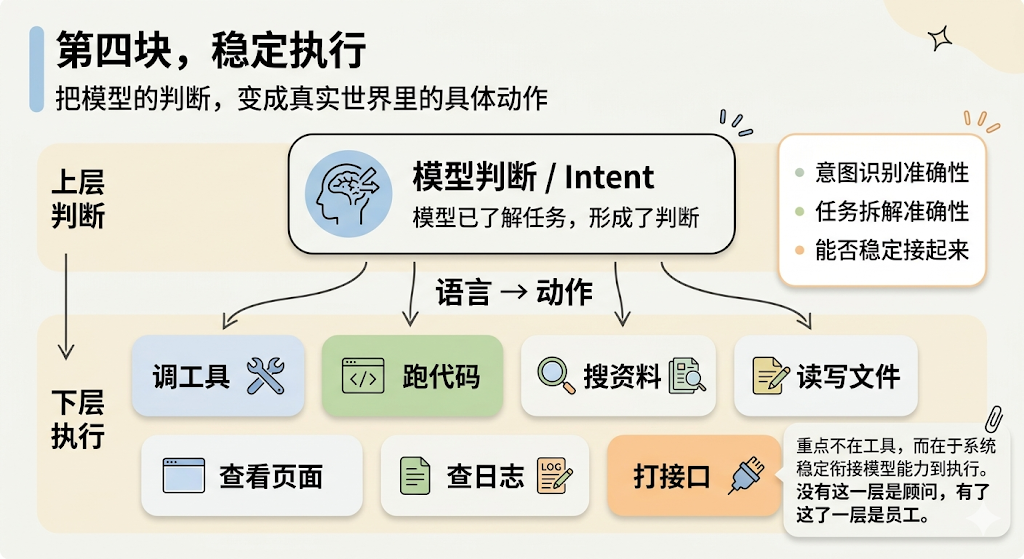 也就是重点是系统有没有办法把这些能力稳定地接起来,让模型真的能动手,而不是只会给建议。