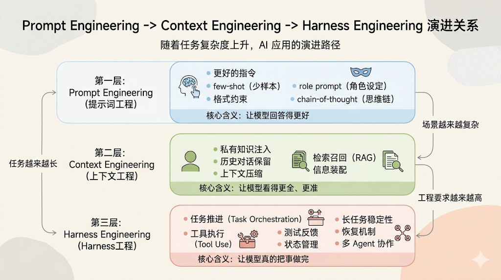 从Agent不满足于只是问答,场景就变得更加不可控制了,上下文工程也就做到头了,为了应付任务链路越来越长的问题,Harness开始登场: