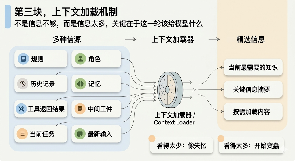 这里的问题就很具体了,不在于信息不够,而在于信息太多。到底什么该进来,什么只给摘要,什么按需去查,什么干脆别放,这些都要有人管。