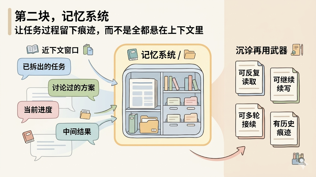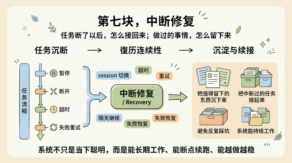 如果系统没有恢复能力,之前做得再好,断一次就前功尽弃。如果系统没有记忆沉淀能力,踩过的坑还是会反复踩。
