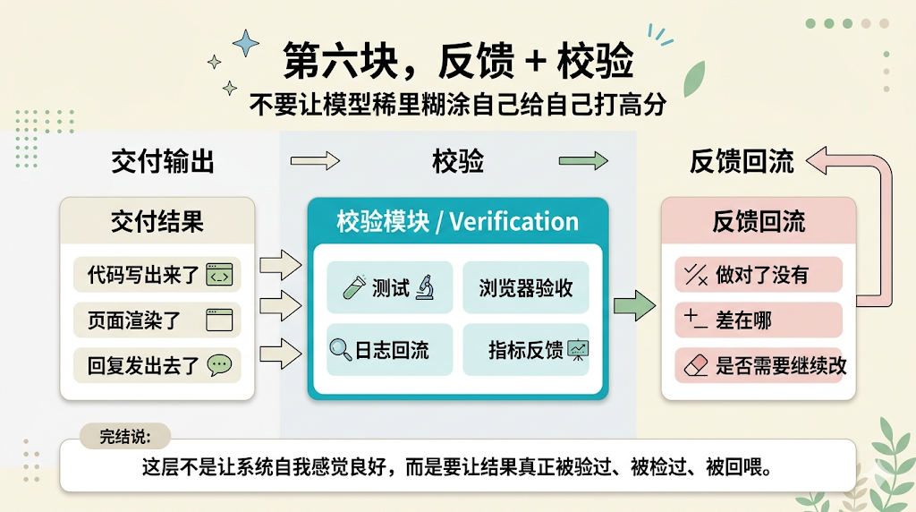 这一层在有些系统里表现成测试,在有些系统里表现成浏览器验收,在有些系统里表现成日志和指标回流。形式不一样,但目标是一致的: