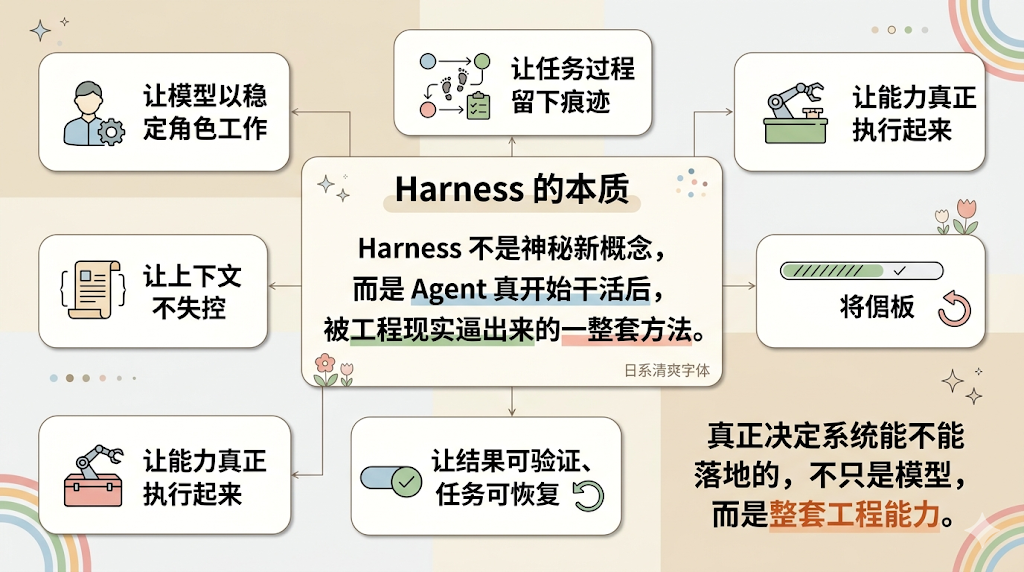 Harness是一套工程架构,他的目标是让模型能以一个稳定角色工作、让任务过程有痕迹、让上下文不失控、让能力真正能执行、让任务持续推进、让结果可被校验、让中断之后还能恢复