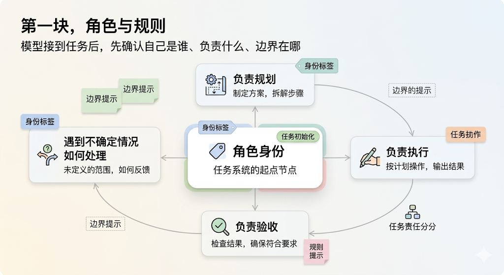 所以Harness最先控制的的不是功能,而是身份。也就是先把模型规划成一个能工作的角色,从这里的目标就不是随便聊两句。