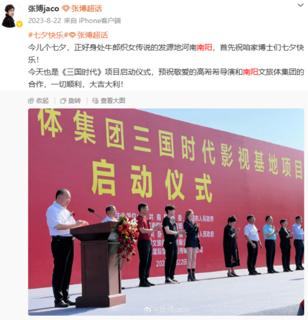 在“新三国”中饰演孙权的张博发微博祝贺《三国时代》项目启动。(图/微博@张博jaco)
