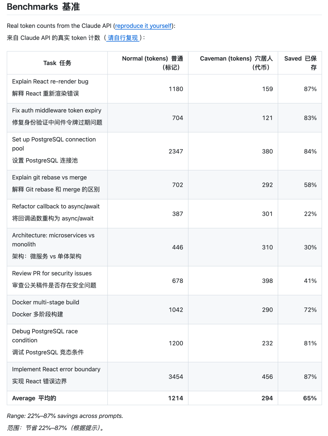 在展示的多项基准任务里面,使用Cavemen项目之后,能节省约65%的Token,同时能保证输出内容的100%准确。