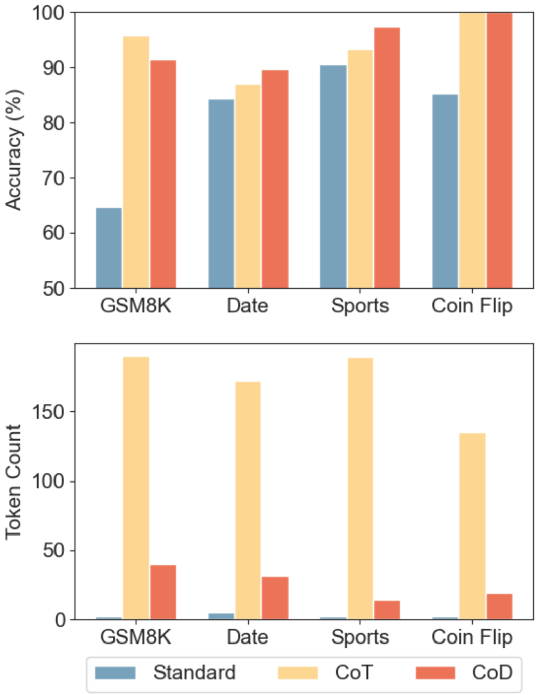 结果,CoD在保持甚至超越CoT准确率的同时,消耗的Token数量大幅减少,最低仅为CoT的7.6%。