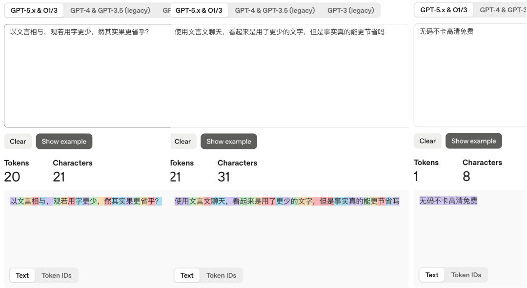 就像下面的例子,一开始使用文言文只有21个字符,但是Token数也是20,切换到白话文,字符数来到31个,Token数依然是21。