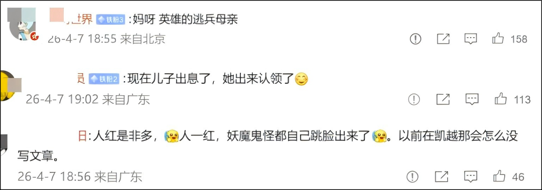 评论区骂声一片:“英雄的逃兵母亲”“妖魔鬼怪跳出来了”。还有人翻出母子合影,说张雪防御性坐姿,因为他根本不喜欢这个势利眼母亲。