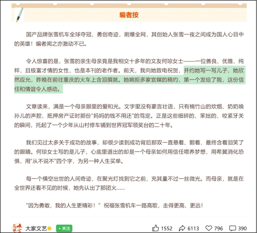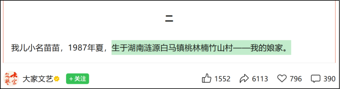 再看看她写了什么。那篇长文里,她写张雪在外婆家出生。注意,此地距张爸家300公里,今天开车都要3个小时。