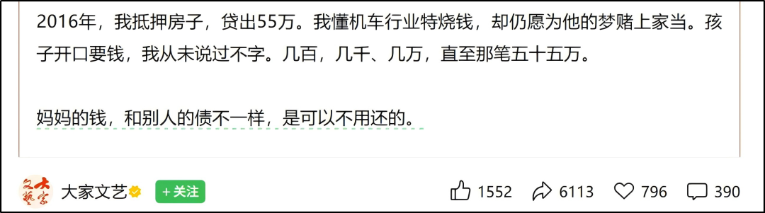 要知道,何女士拿房抵押贷款了55万。抵押房子和卖房差别不大,都到了为一个人赌上自己一切的地步。