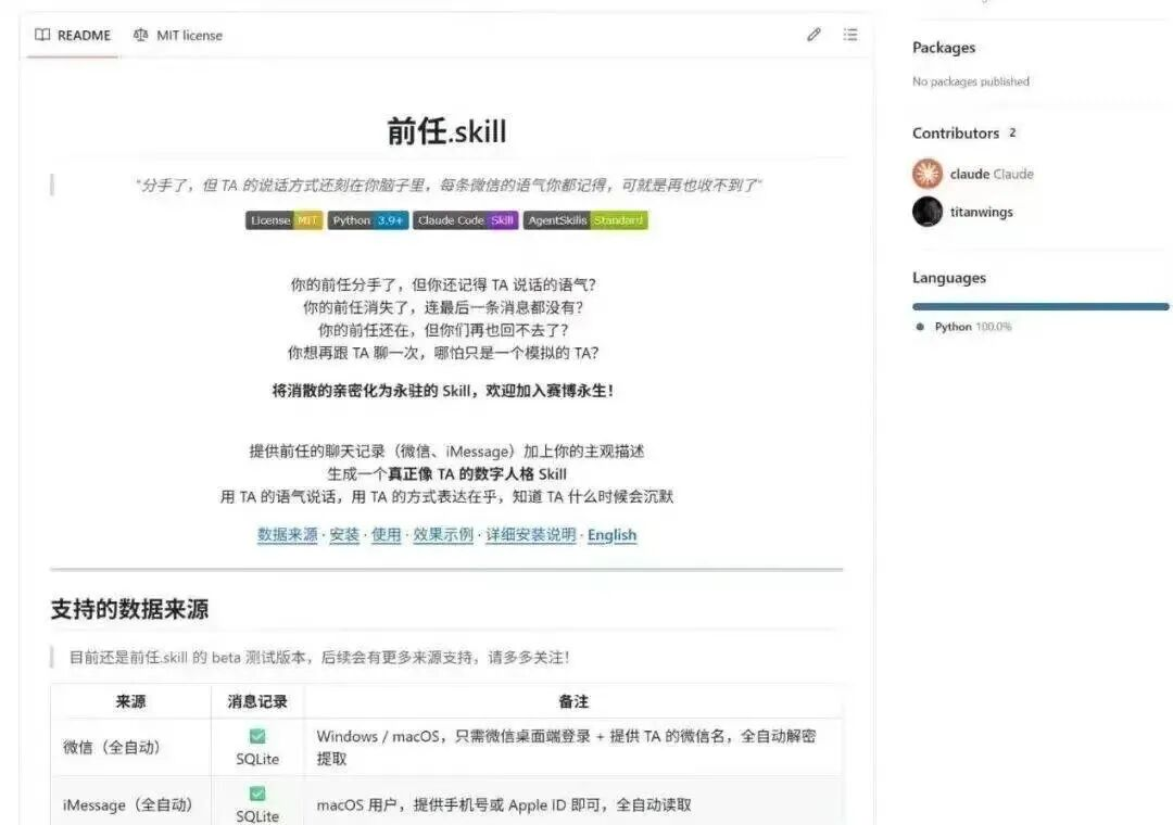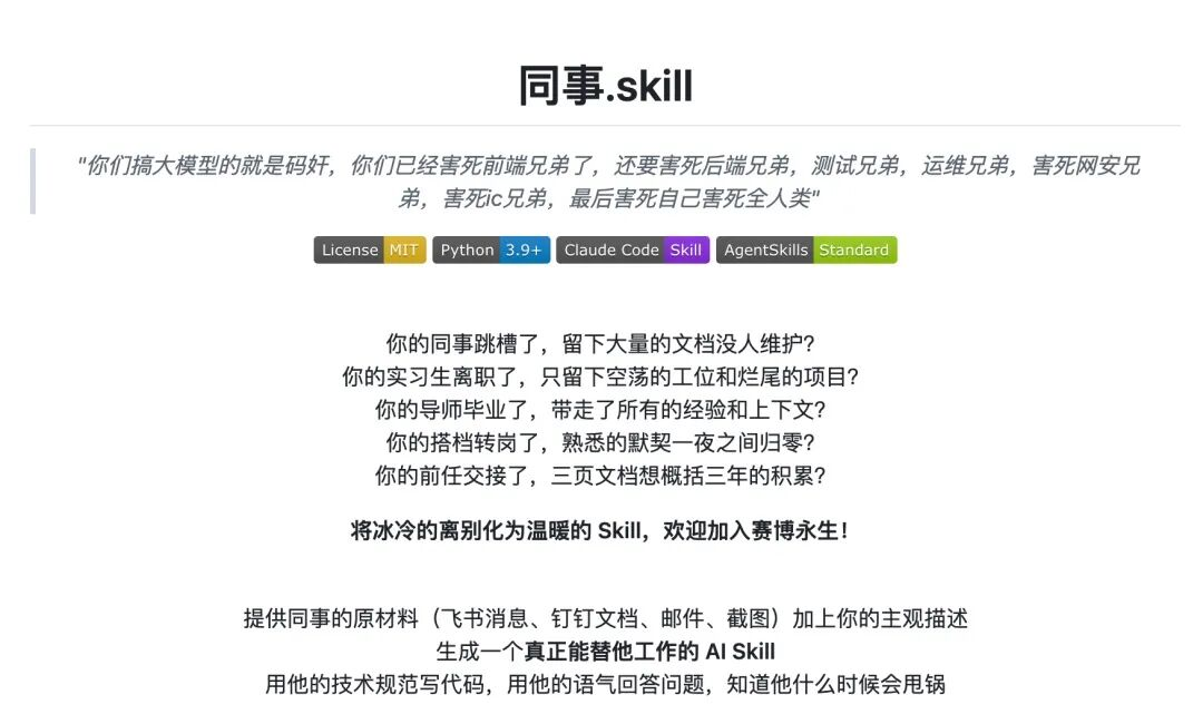 这个项目的描述十分温情:“将冰冷的离别化为温暖的skill,欢迎加入赛博永生。”网友玩梗道:“同事,散是Token,聚是skill”,很快,前任skill、老板skill、父母skill、暗恋对象skill等接连冒出来。