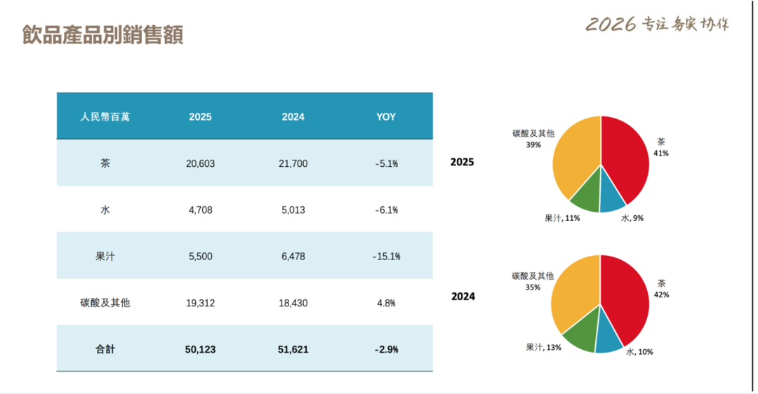 分品类来看,传统优势品类普遍承压:茶饮料收入206.0亿元,同比下降5.1%;包装水收入47.1亿元,同比下降6.1%;果汁收入55.0亿元,同比降幅达15.1%。唯有碳酸及其他饮料(主要为百事系列)实现逆势增长,收入193.12亿元,同比增长4.8%。
