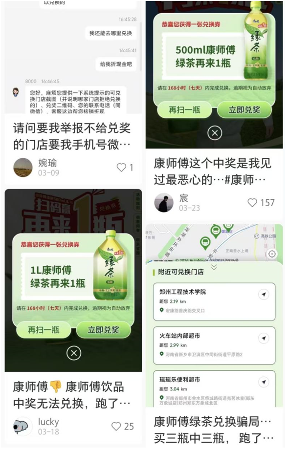 近日,康师傅绿茶推出再来一瓶促销活动,自3月1日起至9月30日,扫码瓶盖内码就有概率中再来一瓶兑换券,但该活动上线后却陷入“兑换困局”,引发大量消费者投诉,多地消费者反映中奖后遭遇兑换无门、商家推诿等问题。